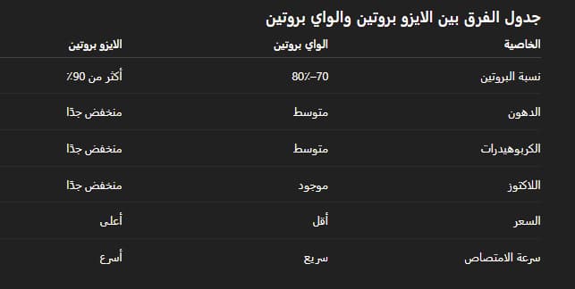 الفرق بين الأيزو بروتين (Whey Isolate) والواي بروتين (Whey Concentrate) هو أن الايزو بروتين يتم تنقيته بشكل أكبر ليحتوي على أكثر من 90٪ بروتين مع دهون ولاكتوز أقل بكثير، بينما الواي بروتين المركز يحتوي عادة على 70–80٪ بروتين مع كمية أعلى من الدهون والكربوهيدرات (اللاكتوز) .